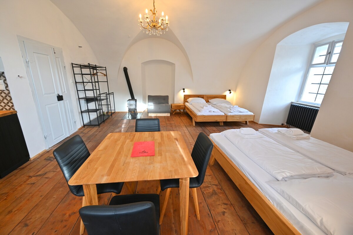 Situé à proximité d'une station balnéaire tchèque Klinovec, notre appartement Loft offre une base confortable et confortable pour vos vacances de ski, de randonnée, de vélo ou de spa. Loft récemment rénové de 54 m2 avec cuisine entièrement équipée, salon, chambre, salle de bain, balcon, espace de rangement pour les vélos et un sauna infrarouge est situé au 4e étage d'une maison avec ascenseur. Nous pouvons accueillir confortablement quatre voyageurs plus deux autres si vous souhaitez utiliser le canapé du salon.