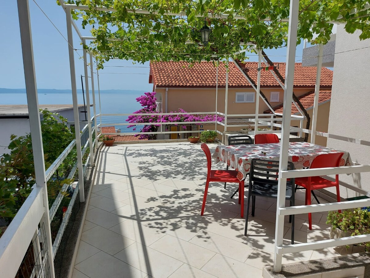 Grand appartement confortable dans un quartier calme à seulement 2 min à pied de la plage et du centre de Podgora. L'appartement se compose d'une chambre avec un grand lit King Size et d'un salon séparé avec cuisine et table à manger. Le canapé dans le salon peut accueillir deux personnes de plus. Il y a une terrasse privée et un balcon avec des chaises, une table et un parasol que les voyageurs peuvent utiliser. La place de parking et le wifi sont inclus dans le prix.