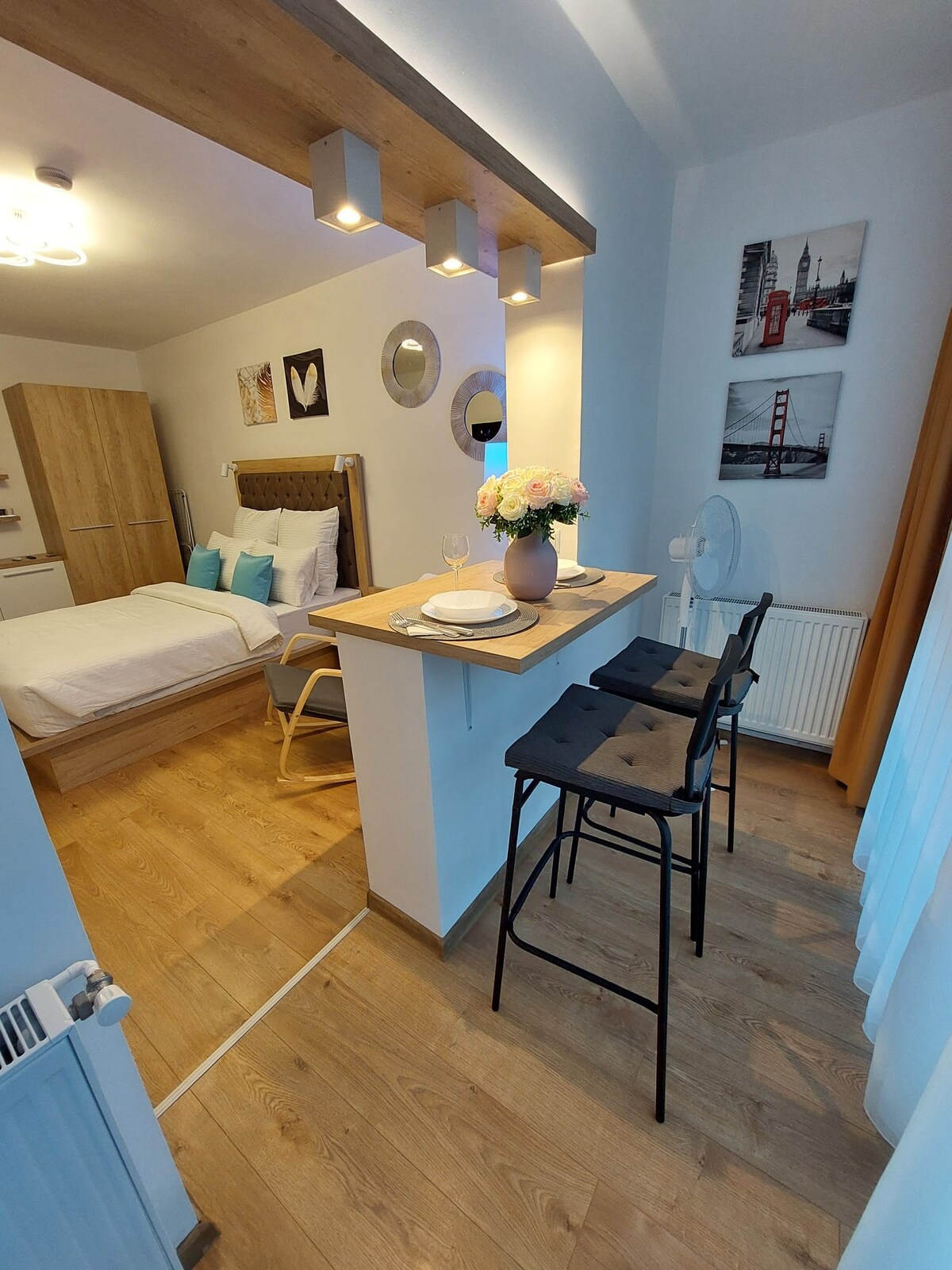 The best place for couples Modern studio newly refurbished with natural light most of the day, welcoming, intimate and cosy. 10 minutes walk to Coresi Brașov Shopping centre 30 minutes walk to Old City centre The location is opposite the Brasov train station 🚆 The bus and taxi station are at 100 meters distance and will take you to the tourist destinations The studio is on the 10th floor and has a gorgeous view to the Coresi Shopping centre 2 elevators available Parking available on payment