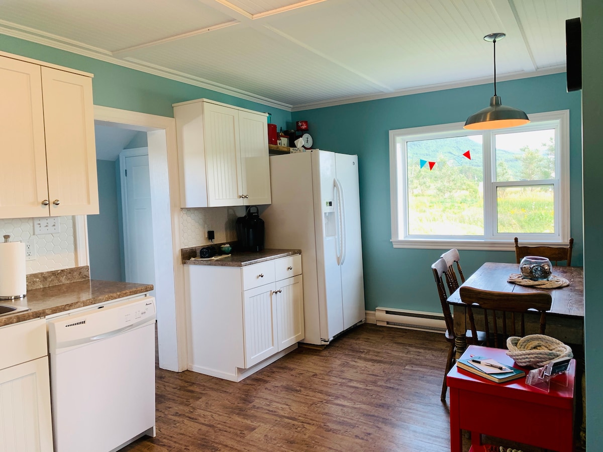 Située juste à l'extérieur de Cheticamp à Point Cross sur l'île du Cap-Breton, la propriété est située au sommet d'une colline, avec une vue fantastique sur l'océan, la montagne et la vallée depuis notre terrasse panoramique. Cheticamp est un village de pêcheurs animé avec une culture acadienne florissante, avec de la musique acadienne locale, des festivals et des restaurants proposant une cuisine traditionnelle et acadienne. À 6 minutes du village de Cheticamp, de la plage de Cheticamp, des croisières d'observation des baleines, des musées, des boutiques.
