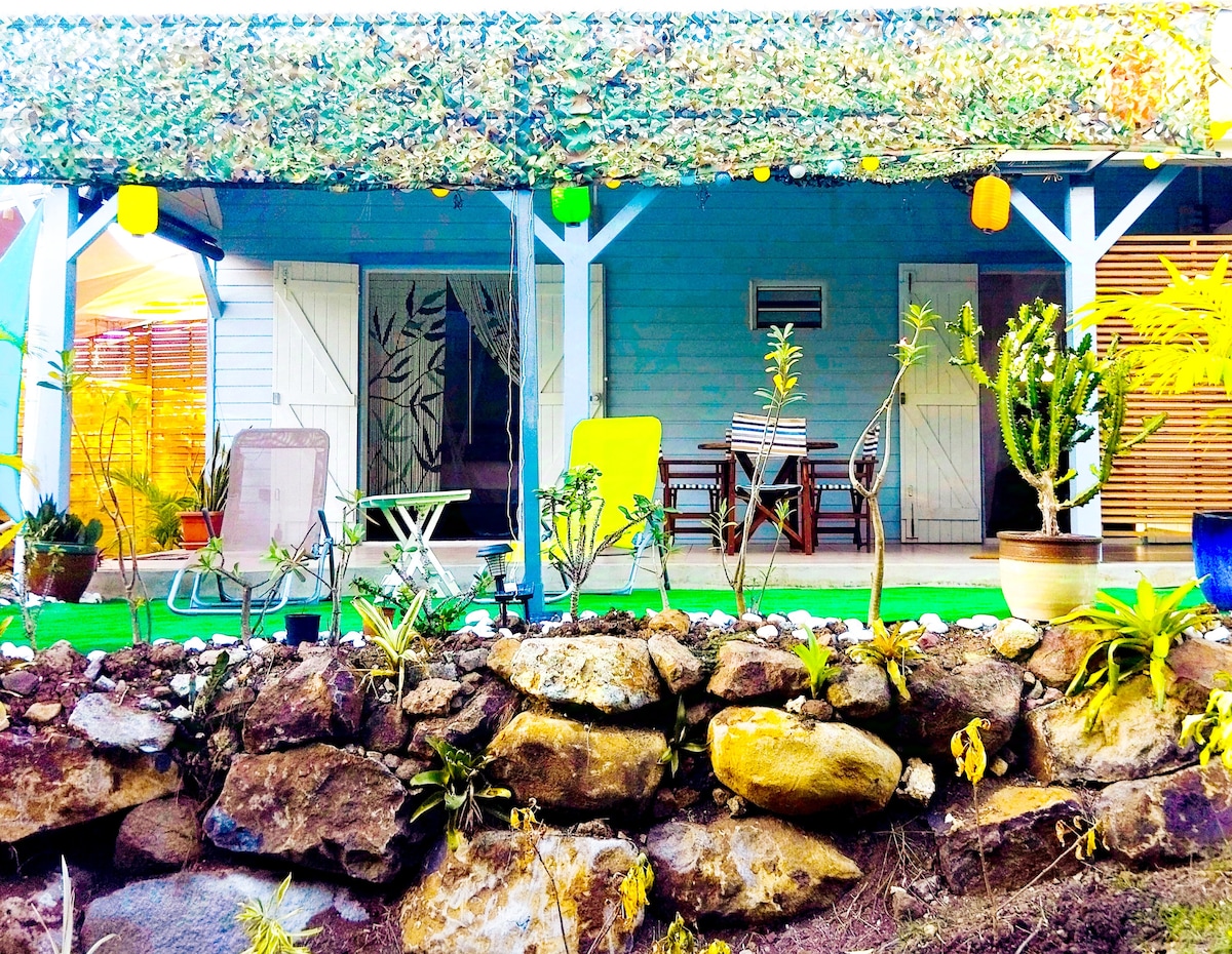 Vivez une expérience unique ! immergée dans un jardin tropical, bingalow vue imprenable sur la mer et la réserve Cousteau. Accessible par un chemin très pentu sur 100m, vous ne pourrez y accéder qu'à pied ou en 4x4 mais je monte vos valises et vos courses. Energie solaire et captage de rivière. Vous serez seuls à profiter de ce magnifique endroit. Venez vivre un moment en harmonie avec la nature et les éléments ! 10 minutes à pied de la mer, 20 de la plage. Cabane avec tout le confort