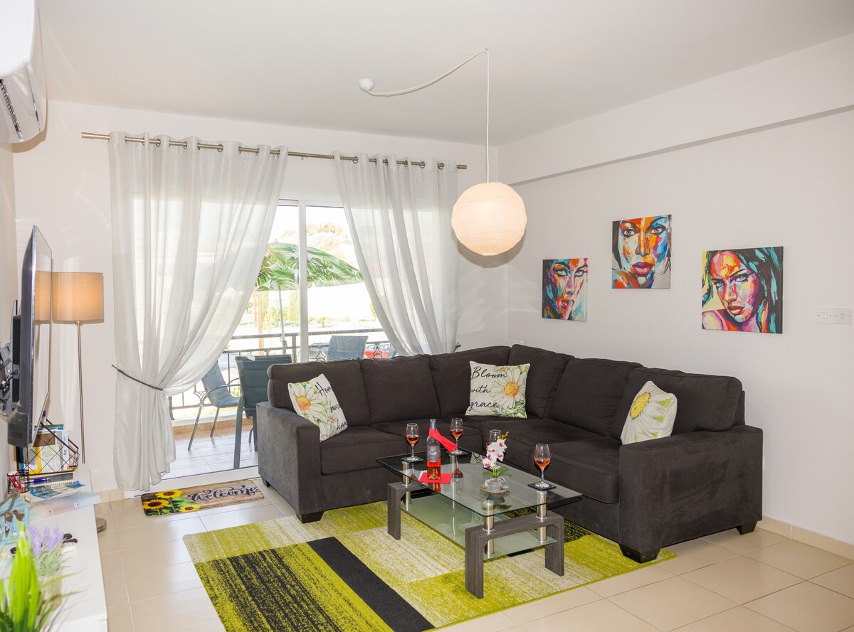 Appartement moderne entièrement équipé et spacieux, récemment peint, nouveaux canapés, nouvelle literie, nouvelles chaises longues, piscine améliorée et mobilier, vue panoramique sur Coral Bay et les montagnes. Piscine commune, sauna, salle de sport, jardins, parking sur place. Capacité d'accueil de quatre personnes, grand balcon, cuisine entièrement équipée, linge de lit/serviettes fournis. Wi-Fi gratuit et télévision internationale. Pas de frais cachés. Conforme à la législation du ministère chypriote du Tourisme.