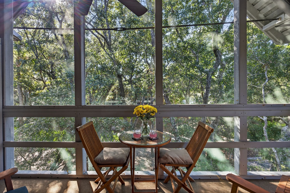 Villa Kiawah au deuxième étage, proche de la plage (moins de 3 minutes à pied) sans routes à traverser, proche de tout. Rénové. Parfait pour les couples à la recherche d'une escapade paisible à la plage. Canapé-lit pour les enfants. Porche grillagé donnant sur la forêt maritime. Observez les cerfs errer et écoutez les oiseaux chanter. Emplacement idéal pour une course au lever du soleil ou une promenade sur la plage avec une tasse de café. Notre condo peut accueillir confortablement 3 adultes, ou 2 adultes et 2 enfants de 12 ans et moins.