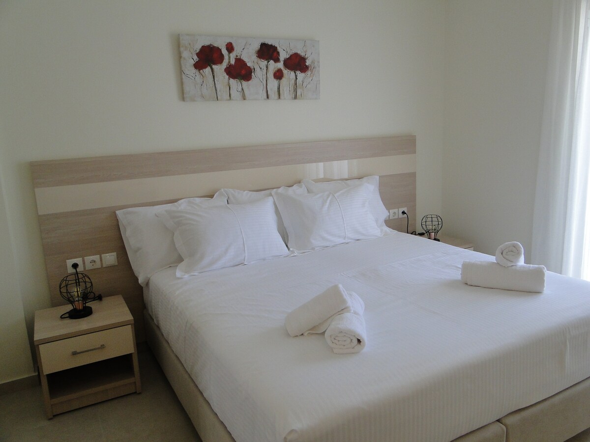 Détendez-vous dans cette chambre calme et élégante avec un grand et beau balcon avec une superbe vue sur la mer sur toute la plage d'Askeli. Il dispose d'une cuisine entièrement équipée, d'une télévision intelligente et se trouve à seulement 40 mètres de la plus grande plage de Poros. Supermarché, boulangerie, location de vélos et d'excellents restaurants sont à proximité. Aida studios est situé dans la région d'Askeli sur l'île de Poros. Il est plus haut, ce qui lui donne une vue imprenable sur la plage d'Askeli, mais cela signifie également que la route pour y arriver est en montée et assez raide.