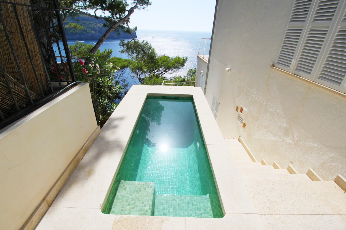 Nous sommes les propriétaires directs et cette saison, nous annonçons cette villa lumineuse exclusive entièrement rénovée avec des vues uniques sur la baie de Puerto de Sóller. Son emplacement, entre mer et montagne, la rend spéciale. L'extérieur du rez-de-chaussée se compose d'une piscine avec douche et de plusieurs terrasses entièrement meublées (avec chaises longues, tables, chaises, barbecue...). La maison est divisée en deux étages équipés individuellement. Pour plus de 5 personnes, vous pourrez profiter des deux étages de la Villa.