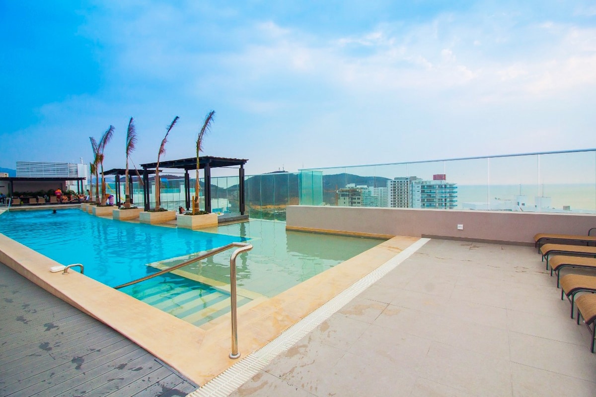 Vue spectaculaire sur la piscine et le parking de Rodadero