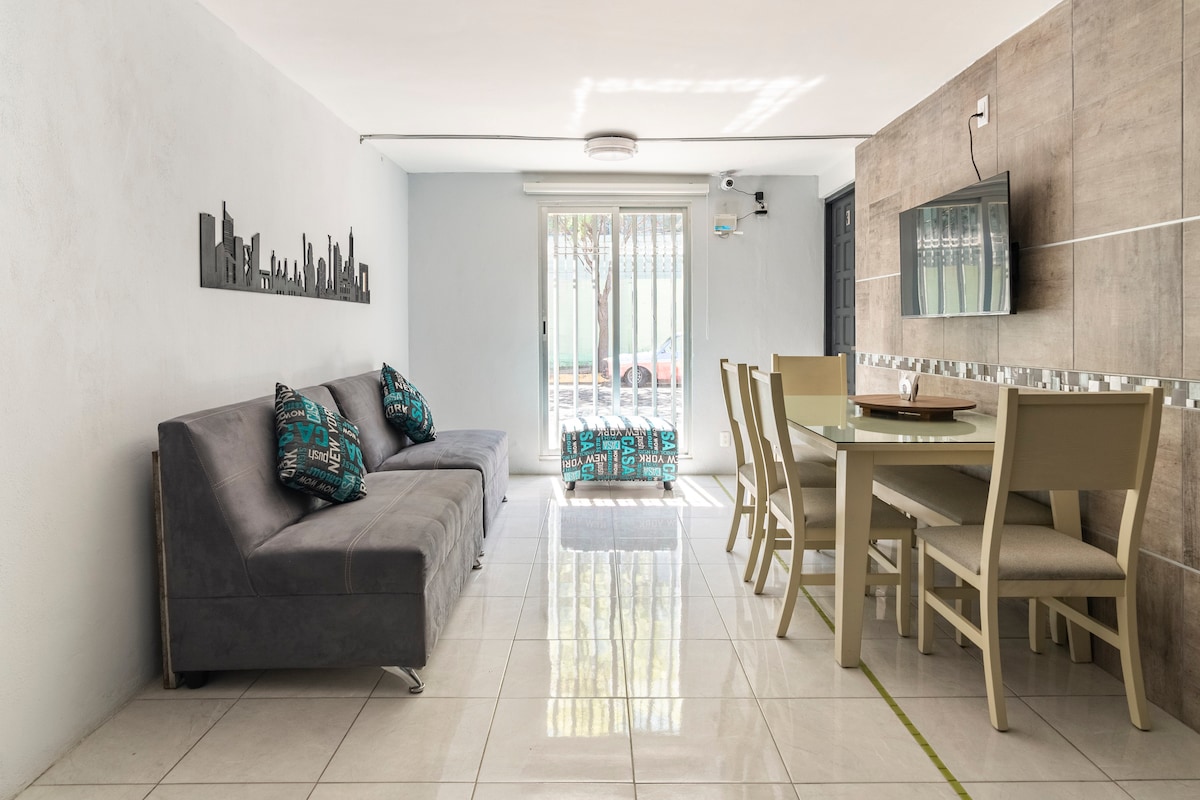 Appartement confortable situé dans un quartier privilégié de Mexico. À seulement 10 minutes de l'aéroport international de Mexico (AICM), à 15 minutes de la basilique de Guadalupe et à 5 minutes du zoo d'Aragon, c'est l'endroit idéal pour explorer la ville en toute simplicité. Profitez du confort et de l'intimité offerts par notre terrasse, parfaite pour se détendre après une journée de visites. Nous disposons également d'un barbecue pour que vous puissiez préparer de délicieux repas en plein air