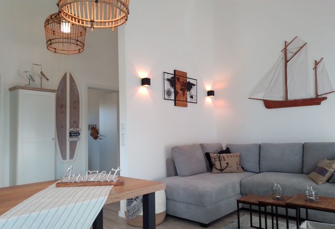 Unter unserem Reetdach haben Sie den Bodden im Blick – die 70 qm große Wohnung teilt sich in zwei Schlafzimmer und einen sehr großzügigen Wohn- und Essbereich auf. Hinzu kommt ein Badezimmer mit Dusche, Toilette und kuschliger Eckbadewanne. Im Wohnbereich mit Sofas und Sessel sorgt der Kamin in stürmischen Zeiten für wohlige Wärme. Die voll ausgestattete Küche lädt zu geselligen Kochabenden ein.