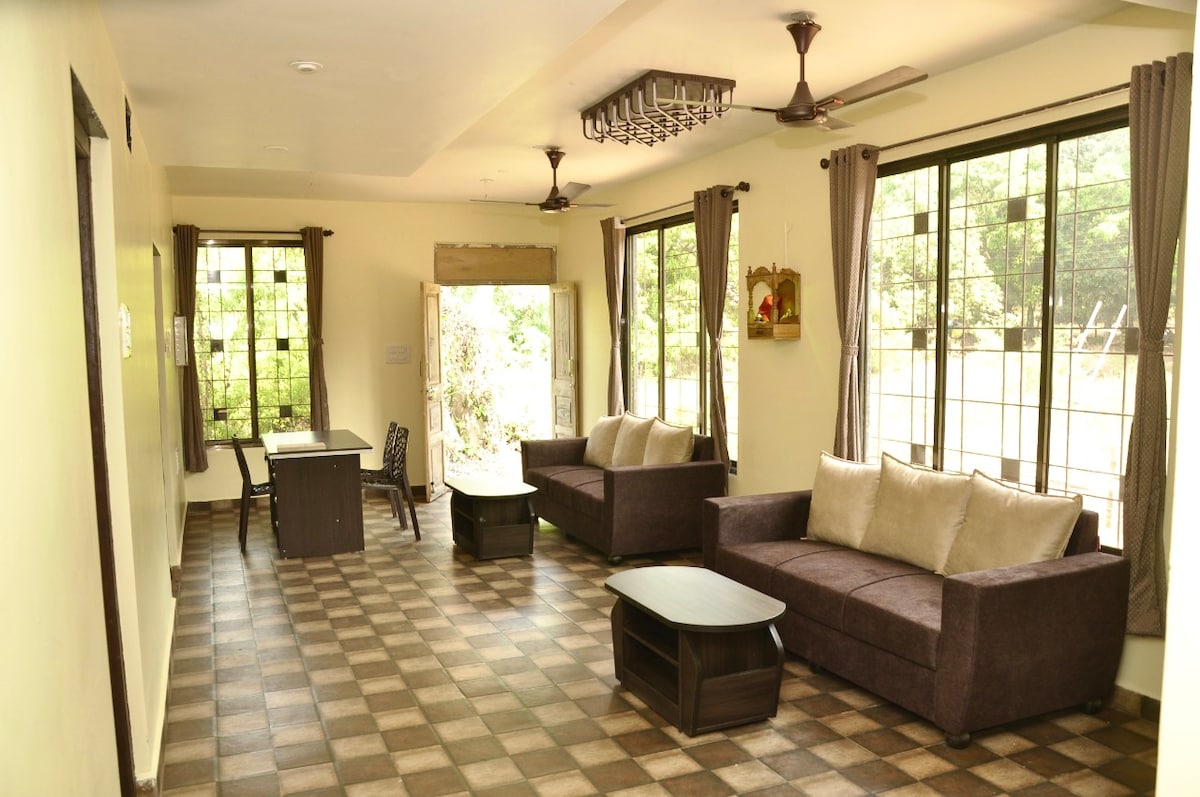 Le bungalow, construit sur un verger de 4 acres dans le pittoresque Konkan, est une escapade parfaite pour la famille et les amis ou un endroit serein pour« travailler à domicile » avec un réseau BSNL. L'aéroport de Sindhudurg-Chipi et les attractions touristiques se trouvent à environ une heure de route. Connectez-vous à la nature à un rythme détendu. Régalez-vous de la verdure verdoyante. Réveillez-vous à l'appel des oiseaux, marchez jusqu'au bord de la rivière ou faites des vagues au bord des vaches pour paître. Détendez-vous sur des hamacs ou détendez-vous dans une piscine. Les enfants vont adorer la nature. Bienvenue