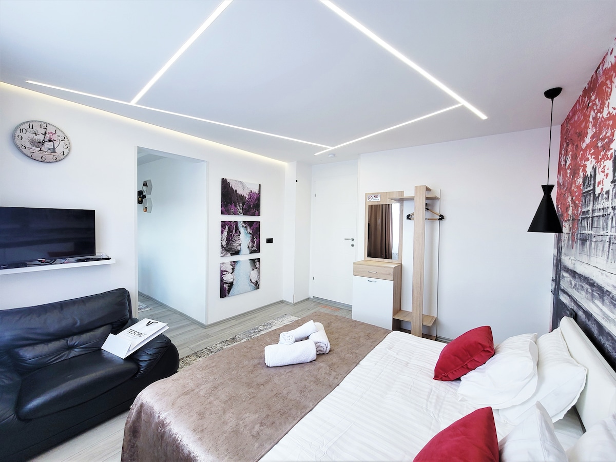 Séjournez dans cet appartement moderne et élégant en plein cœur de Prishtina. Parfait pour les couples, il dispose d'une salle de bain vitrée, d'un salon séparé et d'une cuisine entièrement équipée. Réveillez-vous avec de belles vues depuis le lit queen size confortable et profitez de l'espace lumineux et élégant avec un mobilier haut de gamme. De grandes fenêtres créent une atmosphère paisible et accueillante. Situé dans le centre animé de Prishtina, vous êtes à quelques pas des meilleurs restaurants, cafés et attractions tout en profitant d'une retraite privée.