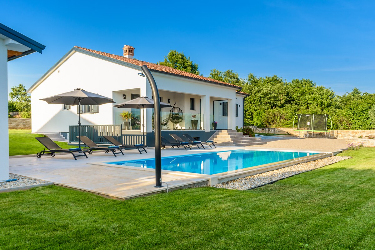 Stylish villa near Rovinj with picture worthy pool, sunk in hot tub, sauna. Wake up to lush, panoramic valley views. Couples and family-friendly, a short drive to adventure park, Brijuni National Park, dinopark, medieval towns & local cuisine. It is a true green escape for anyone looking to get back to nature with all the comfort of modern living. Fully equipped for cooking and entertainment in 2600 m2 of garden (football, speed ball, badminton & pool fun) for your kids and loved ones to enjoy.