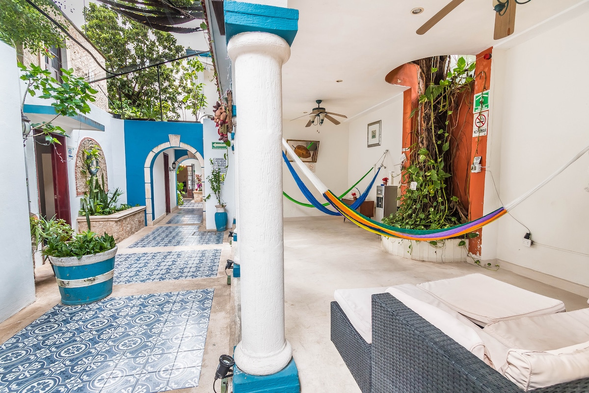 Casa Ufemia, votre refuge au cœur de Mérida, lit QS, salle de bain privée avec eau chaude, climatisation, Wifi, ventilateur et minibar. Détendez-vous sur notre terrasse avec piscine extérieure, parfaite pour profiter du climat de Mérida. Nous sommes à 8 pâtés de maisons du Parc de la Plancha, à 12 pâtés de maisons de la cathédrale, à 15 minutes de l'ambassade des États-Unis, à 20 minutes de l'aéroport, à 5 minutes à pied du marché Chembech. Nous ne sommes pas PET friendly, mais nous avons trois adorables chiots formés.