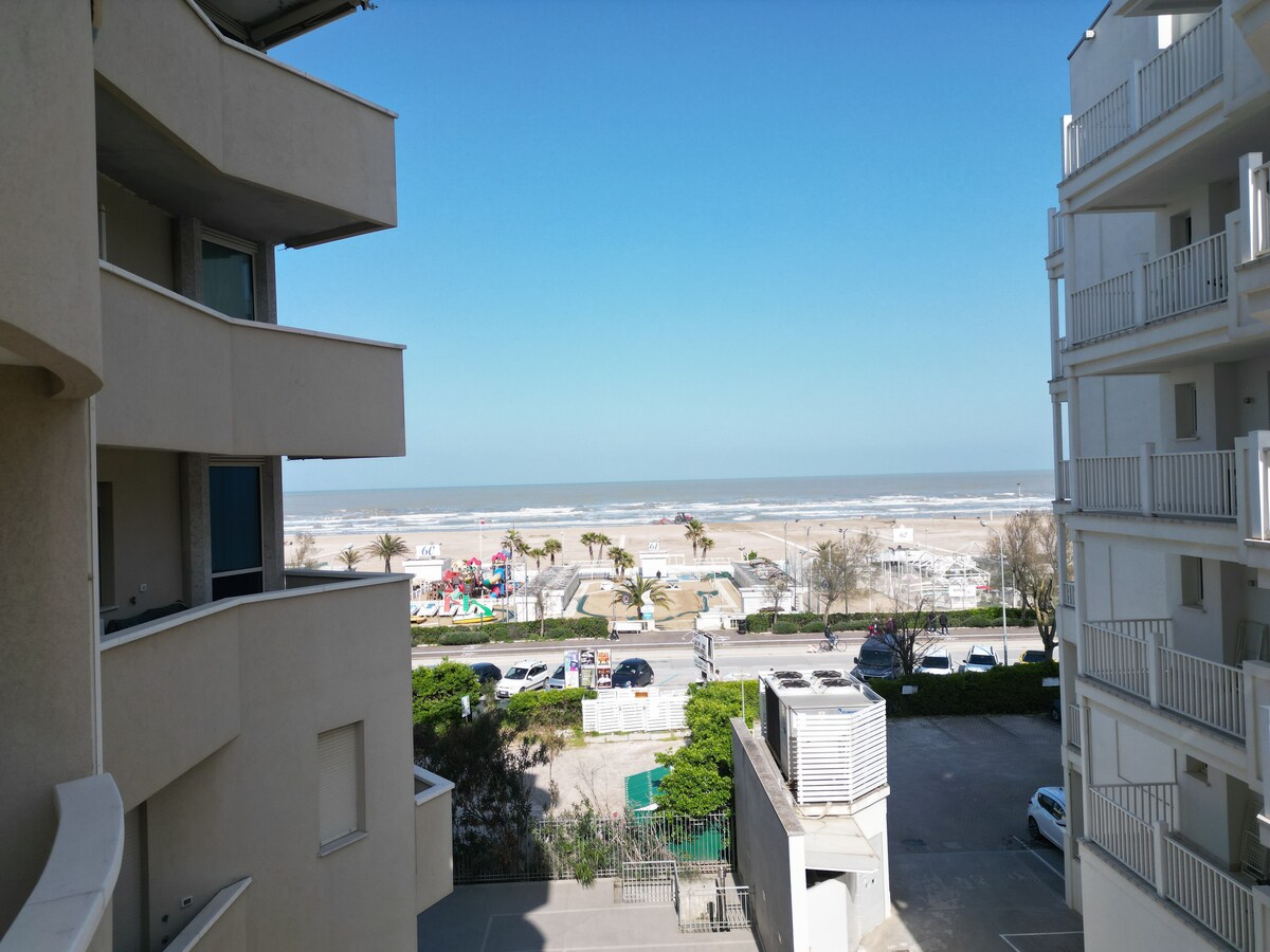 Bel appartement au deuxième étage avec ascenseur pratique pour les familles de 4 personnes ou 3 adultes - Plage à 100 m, - parking gratuit et couvert pour 2 voitures - Les animaux de petite taille sont les bienvenus - WiFi rapide - 1 lit double queen size - 1 canapé convertible confortable pour 2 enfants ou 1 adulte - 1 lit bébé - 1 chaise haute - Cuisine entièrement équipée - 2 grandes terrasses pour déjeuner et se détendre - bars, pâtisseries, glaciers, piadineries, supérettes et salle de jeux à 2 pas