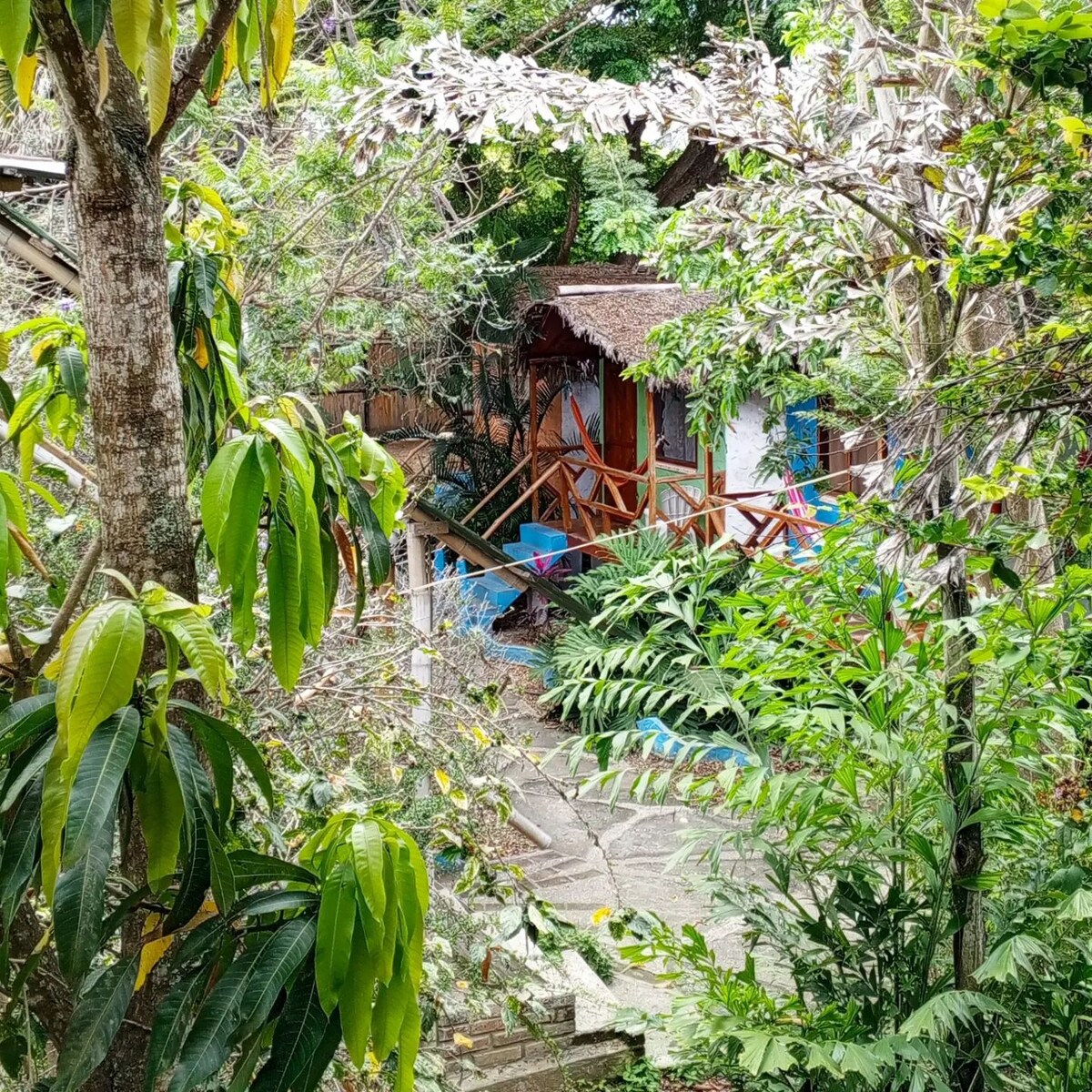 La cabane dans les arbres est neuve en bois confortable et élégant près de la plage, avec petit déjeuner inclus dans le restaurant Delfín Magico, deux vélos pour se déplacer, grande douche, la cabane dans les arbres est à 10 minutes à pied de la plage, moustiquaire comprend. (URL MASQUÉE)