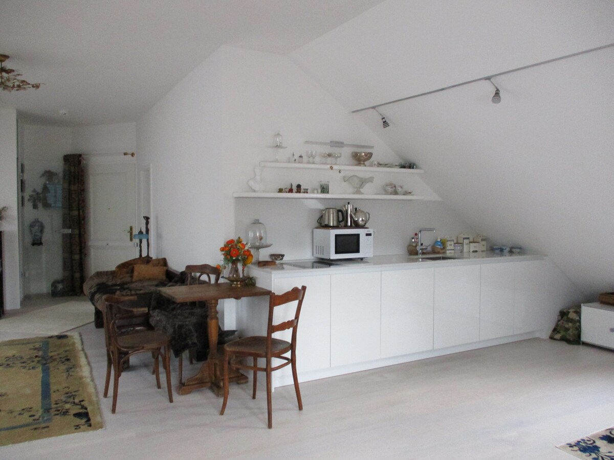 Il s'agit d'un appartement mansardé de 80 m2 sur 2 niveaux (1er étage : couloir, dressing, placard, salle de douche/WC, 2ème étage : loft avec cuisine complète, bar, table à manger, canapé (ou canapé-lit), bureau, poêle, lit double, salle de bain (WC/baignoire/machine à laver) et lit pliant si nécessaire. Monobloc Klimabox. Quartier résidentiel calme en bordure de forêt. Il est toujours facile de se garer partout. S-Bahn 7 min à pied ou 1 min en bus. 15 min en voiture jusqu'à Marienplatz.