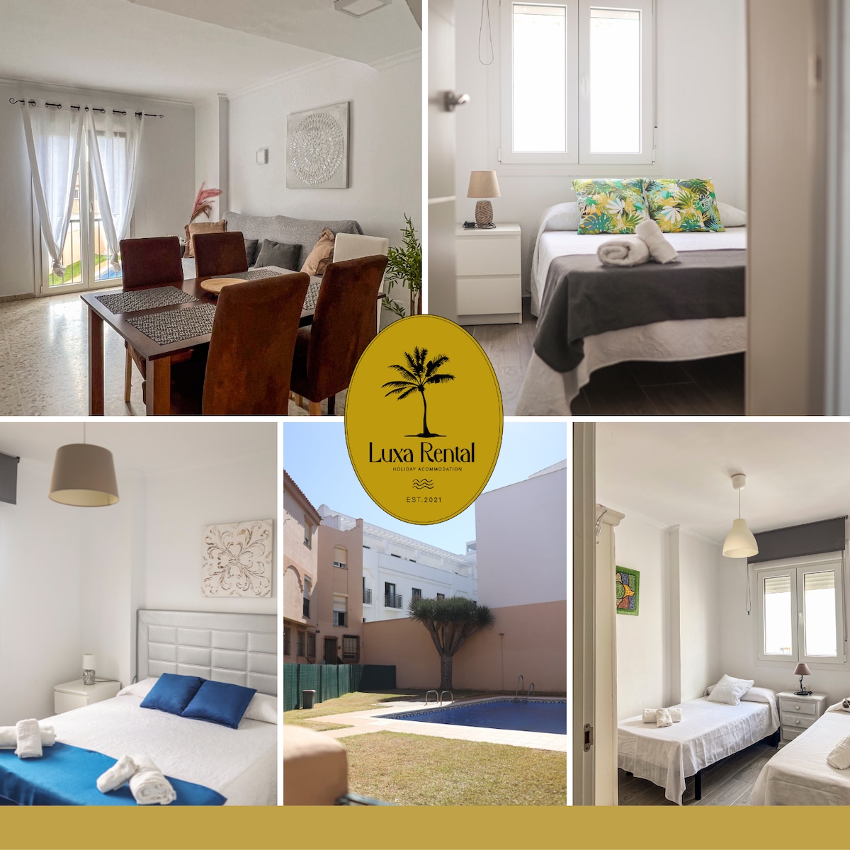 À 100 m de distance : 3 chambres (une avec terrasse avec vue sur la mer). Spacieux séjour avec terrasse avec vue sur la mer. Cuisine(Owen, vitro, réfrigérateur, micro-ondes et lave-linge). Deux salles de bain (baignoire+douche). Wiffi et tv imagenio avec chaînes internationales. Piscine communautaire.