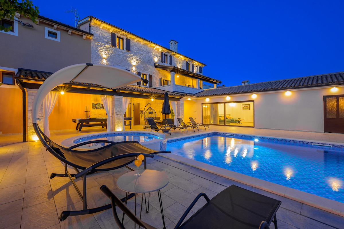 Stylish villa near Rovinj with picture worthy pool, sunk in hot tub, sauna. Wake up to lush, panoramic valley views. Couples and family-friendly, a short drive to adventure park, Brijuni National Park, dinopark, medieval towns & local cuisine. It is a true green escape for anyone looking to get back to nature with all the comfort of modern living. Fully equipped for cooking and entertainment in 2600 m2 of garden (football, speed ball, badminton & pool fun) for your kids and loved ones to enjoy.