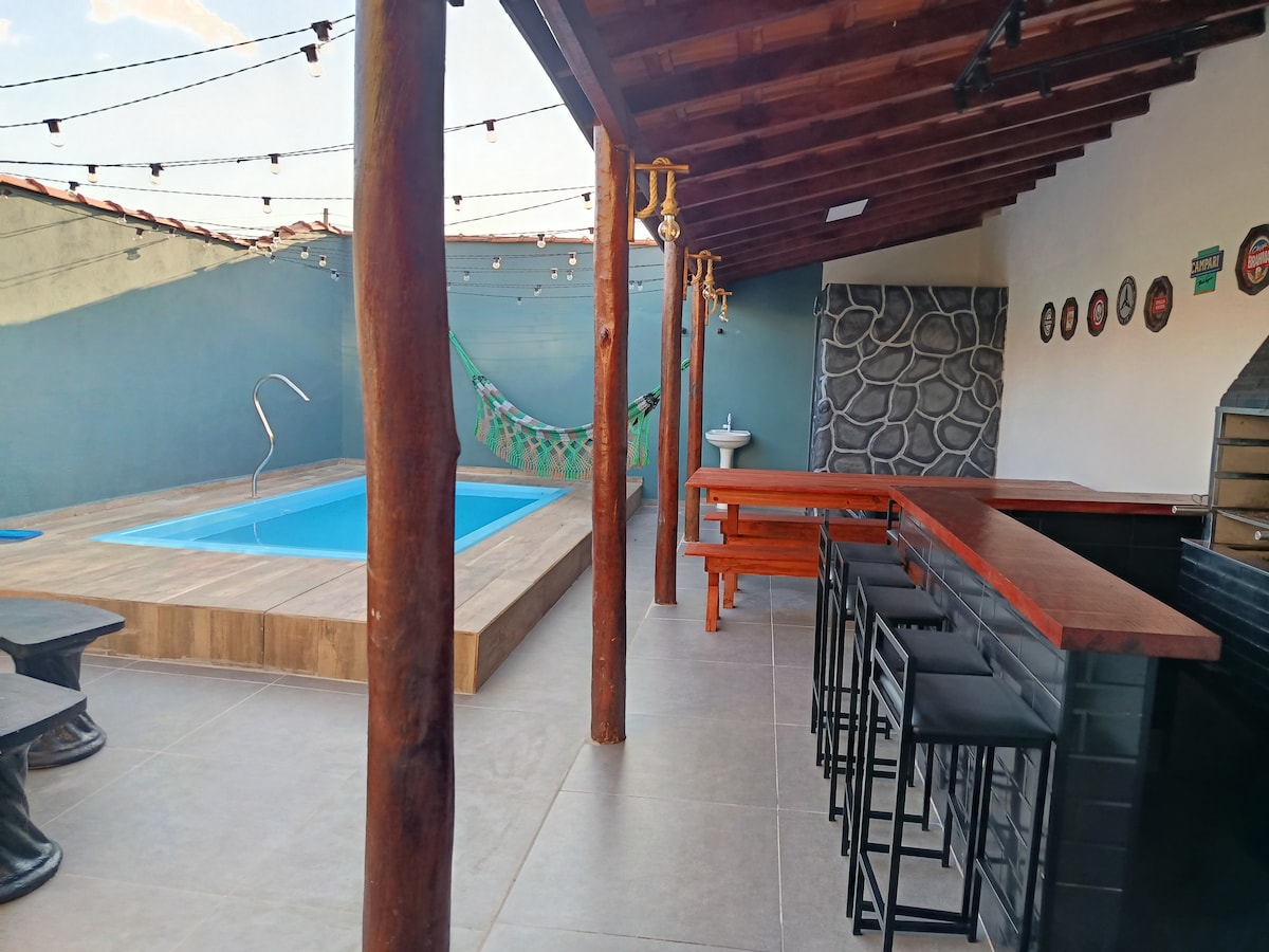Maison confortable à Ribeirão Claro (PR), idéale pour 6 personnes maximum. Elle dispose de 3 chambres (deux avec lits doubles et une avec un lit simple), de la climatisation dans la suite et dans le salon, d'une cuisine complète et d'un espace de loisirs avec piscine et barbecue. Garage pour deux voitures et espace pour un petit bateau. Parfait pour ceux qui recherchent le confort, la nature et des moments inoubliables en famille ou entre amis.