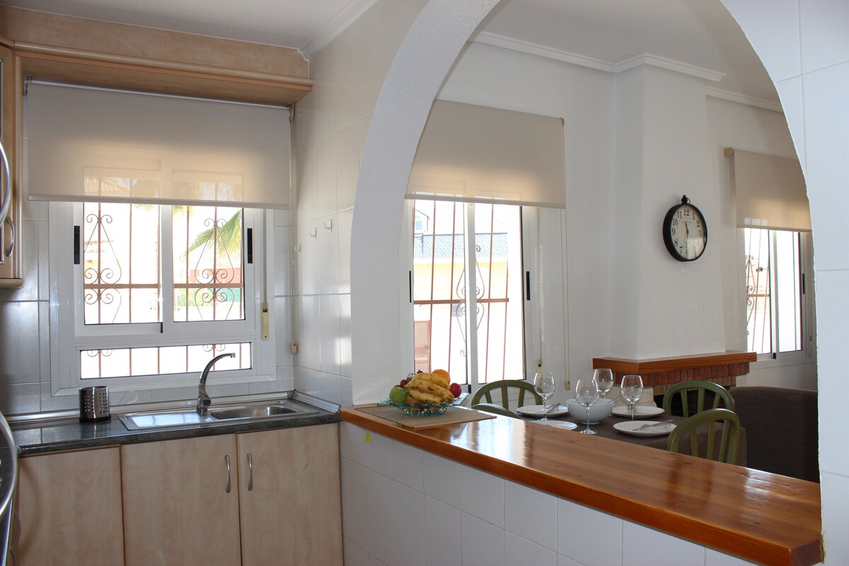 Joli bungalow vue mer, entièrement rénové et décoré avec beaucoup de soin. Tout le mobilier est neuf. Salon, salle à manger, 2 chambres à coucher avec armoires encastrées. 3 très grandes terrasses, une magnifique piscine communautaire. A moins de 5 min de deux de golfes internationaux “Villamartin Golf” et “Real Club Golf Campoamor” et à 10 min des golfes “Las Colinas Country Club” et “Las Ramblas Golf”. A 3 km de la magnifique Plage de la Zenia et à 2 km du Shoping Center Zenia Boulevard.