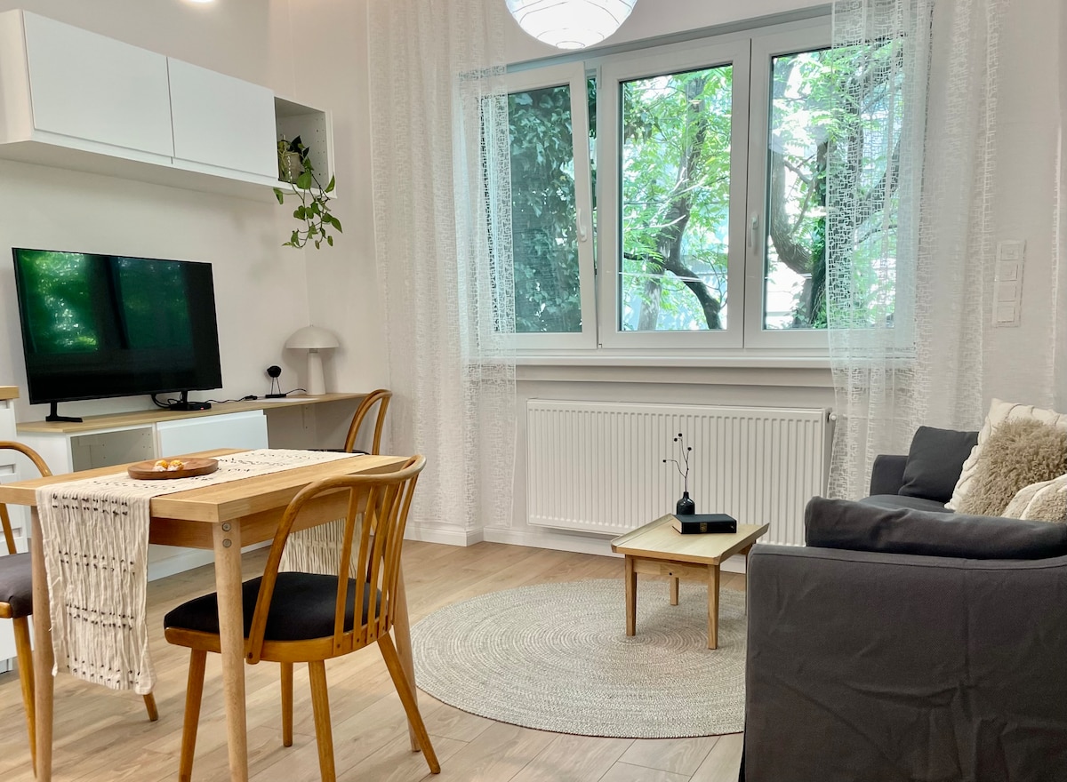 Beautiful, modern, bright and newly furnished apartment with balcony in the 13rd district close to the Danube! FREE PARKING in the garage. Lovely and peaceful location, however it has quick access to the city center (Deák square 12 min by metro/no transfer). The metro station is 150 m from the apartment! Free gifts for our guests! It can accommodate 4 people. The air-conditioned apartment has a bedroom for two (king bed - 180x200), a spacious living room with a sofa-bed for two (150x200).