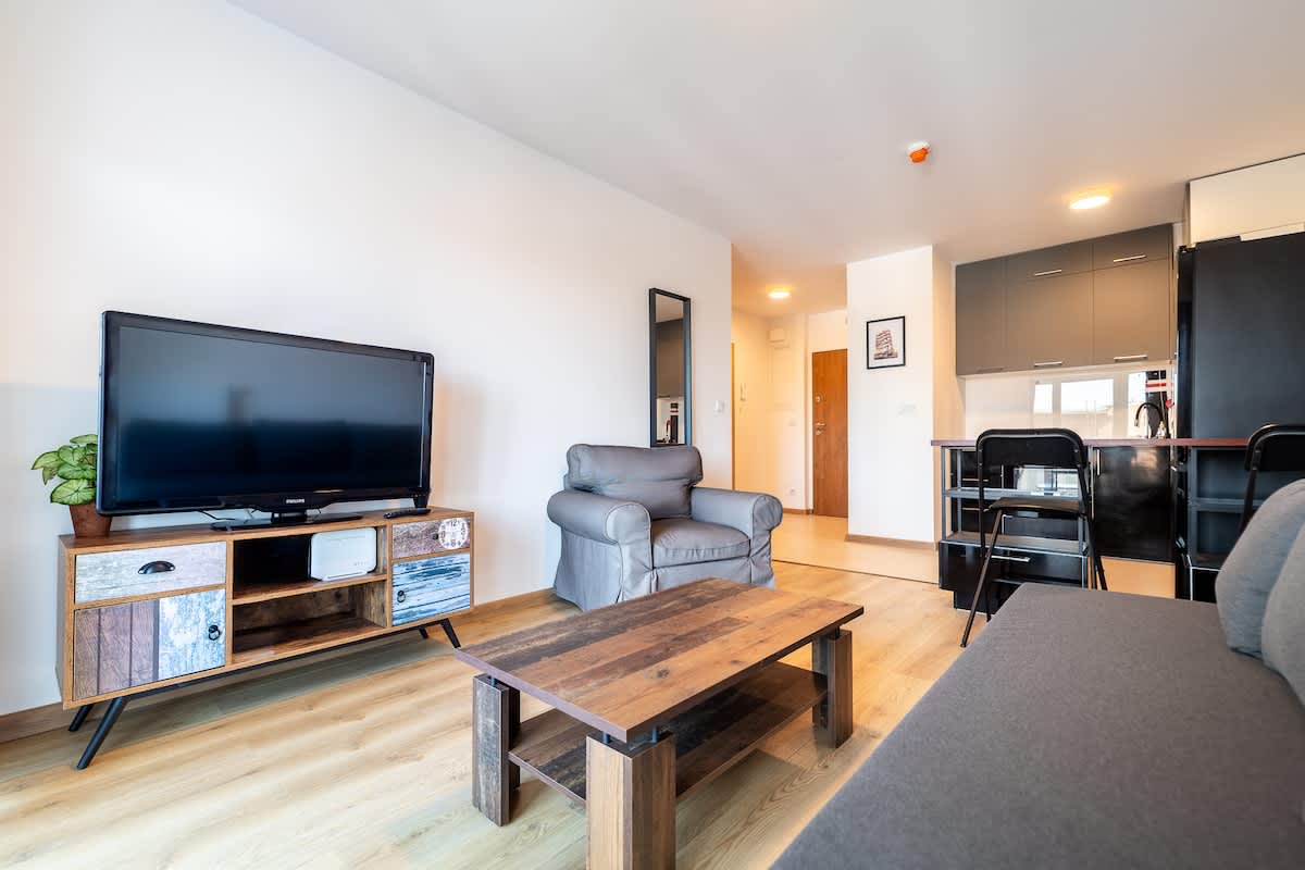 Un appartement exclusif, moderne et fonctionnel avec une chambre, un grand salon avec une belle vue sur Wroclaw. Il est situé dans un nouvel immeuble au 13e étage avec son propre parking souterrain et une sécurité 24h/24 et 7j/7. La cuisine entièrement équipée vous permet de préparer des repas faits maison. Le haut niveau, le confort, la sécurité et le sentiment d'intimité permettent aux voyageurs de se sentir chez eux. Internet sans fil et Netflix. Accès au gymnase, au sauna sec et à la vapeur, au jacuzzi et à la salle de jeux pour enfants.