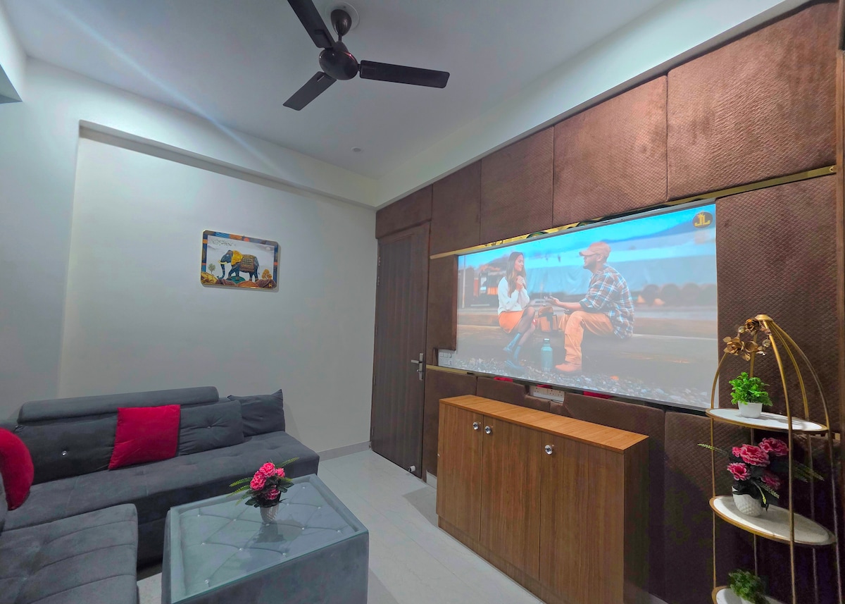 Bienvenue dans notre incroyable suite située au 15e étage d'un immeuble de grande hauteur. Ce 2bhk est un appartement entièrement neuf. Le grand patio privé avec vue sur la ville la rend unique en son genre. L'endroit est parfait pour se détendre et profiter d'une vue panoramique sur l'architecture moderne. L'appartement est équipé de 3 téléviseurs intelligents (toutes les applications fonctionnent), 2 lits doubles confortables, 2 grandes armoires avec casier, canapé 6 places, table basse élégante, planche à repasser, réfrigérateur, micro-ondes, induction, bouilloire électrique, grille-pain et bien plus encore.