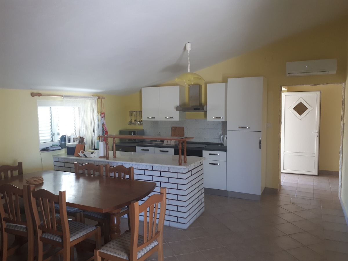 Une maison familiale, divisée en 2 niveaux avec des entrées séparées, chaque niveau est une suite séparée. Idéal pour un séjour en famille. Situé à 20 km de Zadar, grand centre historique, culturel et sportif, à 50 km du paradis des fêtes Zrće. Près de 4 parcs nationaux (Starigrad 30 km, Krka 80 km, Kornati 60 km, Plitvice 110 km). La maison elle-même est à 300 m de la plage. Dans le village, vous trouverez plusieurs magasins, un grand supermarché Tommy, 5 bars de plage, plusieurs bars de restauration rapide, plusieurs cafés et restaurants.