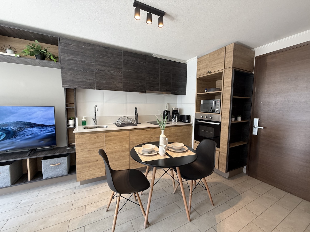 Welcome to your comfortable and modern stay in the heart of Santiago! This bright 1-bedroom apartment is perfect for couples, solo travelers, or remote workers looking to enjoy the city just steps from Plaza de Armas and the metro. ✨ What you’ll love: • Fast and reliable WiFi + dedicated workspace • Smart TV for your favorite apps • Fully equipped kitchen with coffee & tea station • 24/7 concierge • Smart lock (keyless entry) • Secure building • Private balcony with seating to relax outdoors