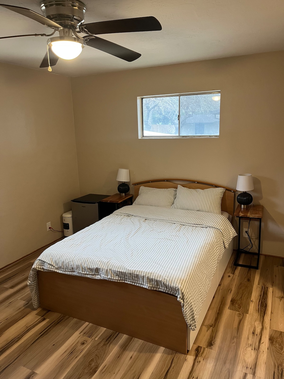 Bâtiment historique de 1905, 2e étage, 1 chambre, 1 salle de bain, cuisine, mobilier neuf et décor coordonné, climatisé, entrée à code, parking sur place et dans la rue, à quelques pas des restaurants, du bureau de poste, des magasins, des boîtes de nuit ; à moins de 1/2 mile de l'autoroute I-5 ; à un pâté de maisons de l'ancien palais de justice et du marché fermier saisonnier du mercredi soir. Pas d'animaux de compagnie, non fumeur, pas de buanderie. Arrivée autonome. Son emplacement pratique au centre-ville signifie que vous pouvez entendre la circulation de la rue, la musique d'un bar local et le train à proximité.