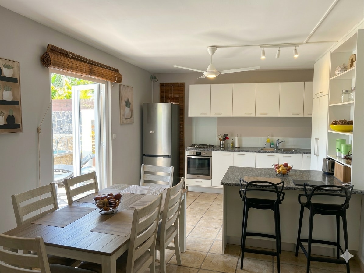 Villa romantique ou familiale avec espaces à vivre ouverts sur un jardin et piscine privée. Situé a 2km de Grand Baie, quartier residentiel et a 500m de la plage. 2 chambres a coucher et 2 sdb attenantes Climatisation dans chambres a coucher Salon et Cuisine toute équipée WiFi illimité et TV Netflix Hotel 5 *, restaurant, cave a vin et Spa a 200m Service de nettoyage 6x la semaine Jardinier et pisciniste 2x la semaine Cuisine et garderie en supplément CCTV sécurité et 1 Parking