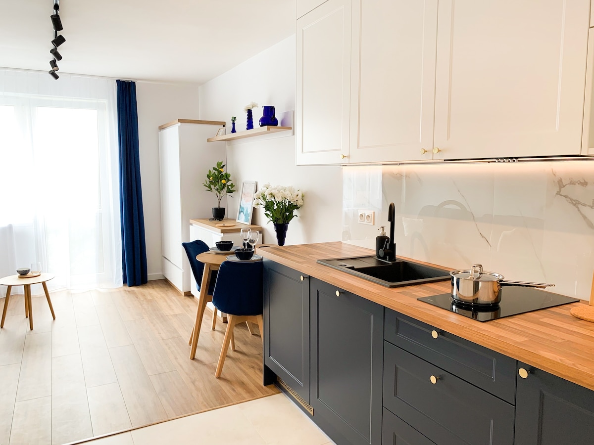 Appartement confortable et entièrement équipé dans un immeuble neuf. Salon avec cuisine ouverte divisé en salle à manger et salon. La chambre dispose d'un grand lit et d'une armoire spacieuse. Il y a aussi un dressing comme espace de rangement supplémentaire. Il y a des magasins, des restaurants et des cafés à proximité Équipement : climatisé, cafetière, bouilloire, fer et planche à repasser, machine à laver Accès depuis l'aéroport Chopin 20 min en taxi 50 min en transports en commun depuis l'aéroport de Modlin 50 min en taxi 120 min en transports en commun