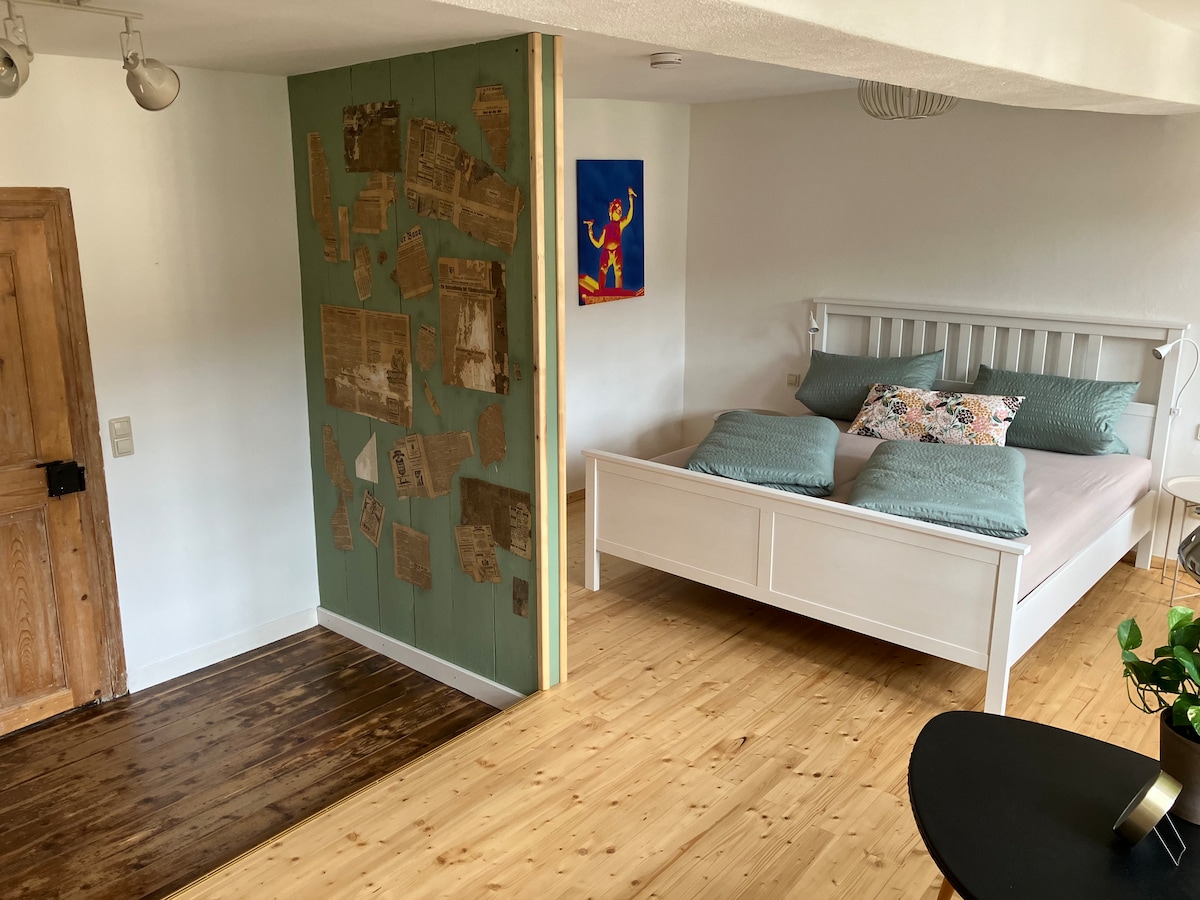 L'appartement a été rénové avec amour en 2021 et dispose de 110 m² (à pleine occupation), avec 3 chambres, 1 salle de bain, cuisine, coin repas, un salon spacieux et un couloir. L'appartement est situé dans une belle ancienne ferme avec une cour intérieure. Une fonctionnalité spéciale est le WLAN gratuit avec une vitesse maximale de 1 000 Mbit/s.