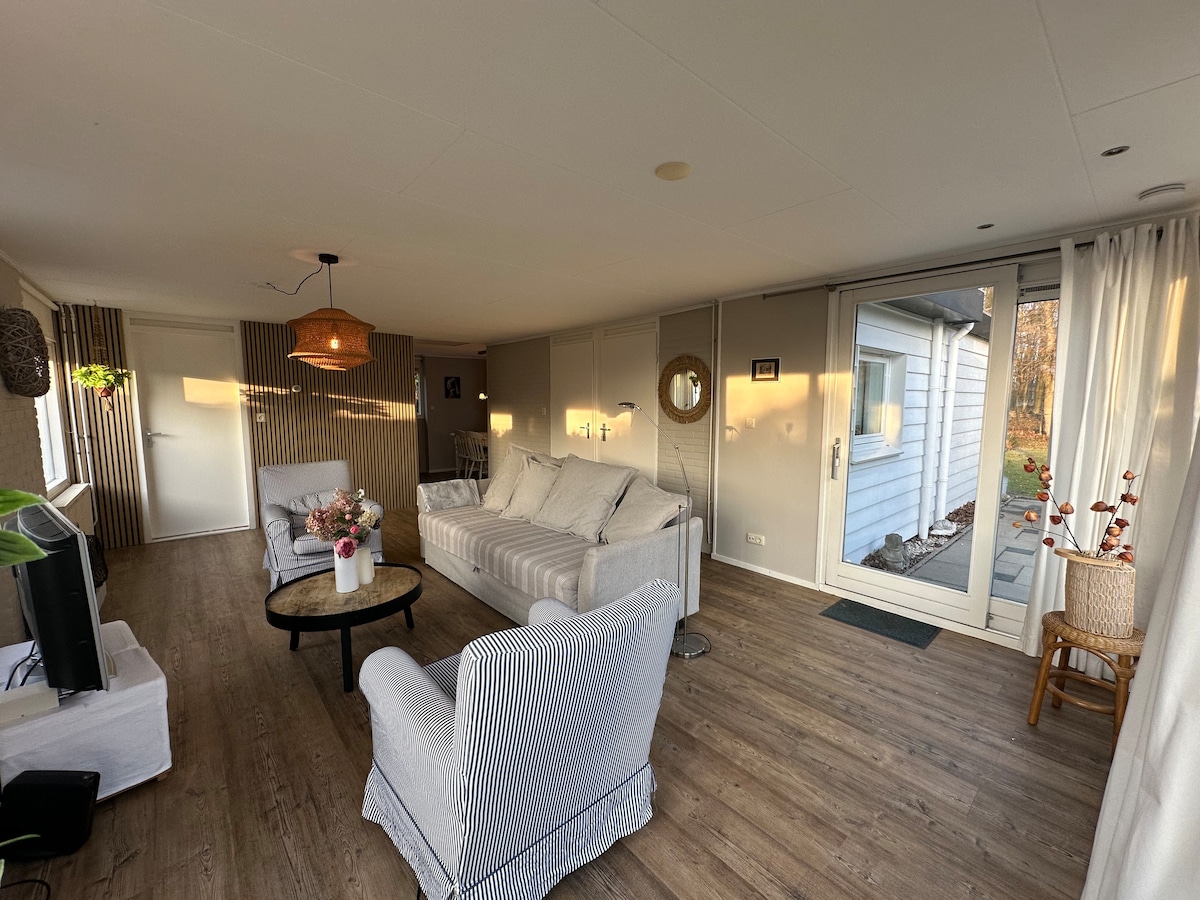 Bienvenue dans ce bungalow confortable, récemment rénové, en bordure de forêt. Réveillez-vous avec le chant des oiseaux et avec un peu de chance, vous verrez des cerfs passer le matin ou au crépuscule. Le grand jardin entièrement clôturé offre soleil et ombre, avec coin salon, table à manger et barbecue. Convient pour 2 à 4 personnes, avec un lit d'hôtel confortable, un canapé-lit et la climatisation. La plage et Renesse sont accessibles à vélo. Place de parking directement à la maison. Chiens acceptés. Détendez-vous en famille dans ce logement paisible.
