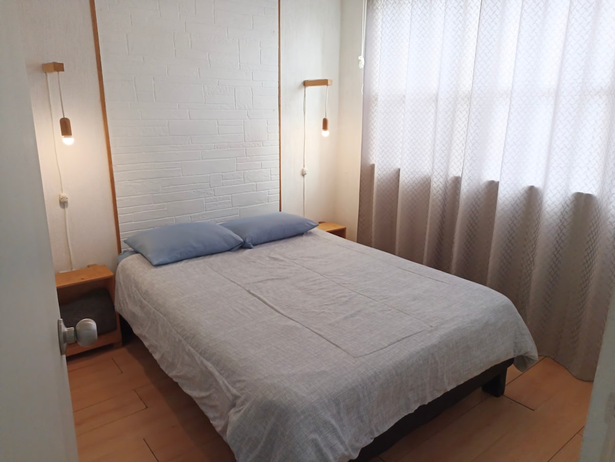 Appartement complet. Chambre avec lit double, minisplit, Internet 50mbps, HBO, Netflix et Crunchy Roll. Les équipements de cuisine disposent d'un poêle, d'un four à micro-ondes et d'un réfrigérateur. Salle à manger et canapé. Parking devant la maison et caméra de sécurité. Pour votre intimité, l'entrée est autonome et ne partage pas de zones avec l'autre appartement. Zone familiale et centrale en face dispose d'un parc et d'affaires et de centres commerciaux à proximité. A 20 min de l'aéroport, 25 min du centre de Mty et 15 min du stade BBVA.