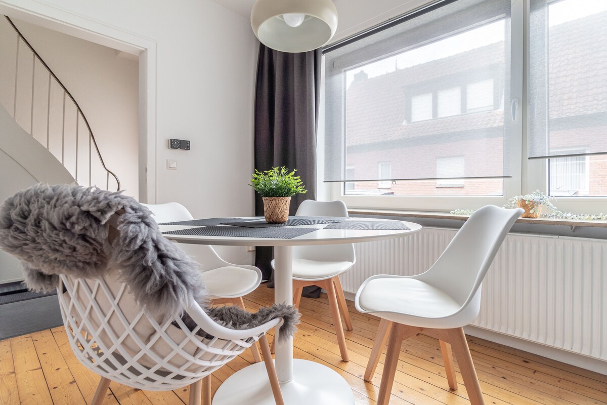 Bienvenue dans notre maison familiale de construction ancienne, que nous avons aménagée avec amour pour 5 personnes. Vous vivez dans le centre de Bocholt, à seulement 5 minutes à pied du beau centre-ville et des commerces de tous les jours. Les points forts suivants vous attendent : - Salle de bain avec douche à l'italienne - Terrasse - Hangar à vélo - Cuisine équipée (cuisinière, cafetière, plaque de cuisson, réfrigérateur, lave-vaisselle, grille-pain, bouilloire) - 4x lits simples (0,9 x 2,0 m) - 1x lit queen size (1,4 x 2,0 m) - Smart TV