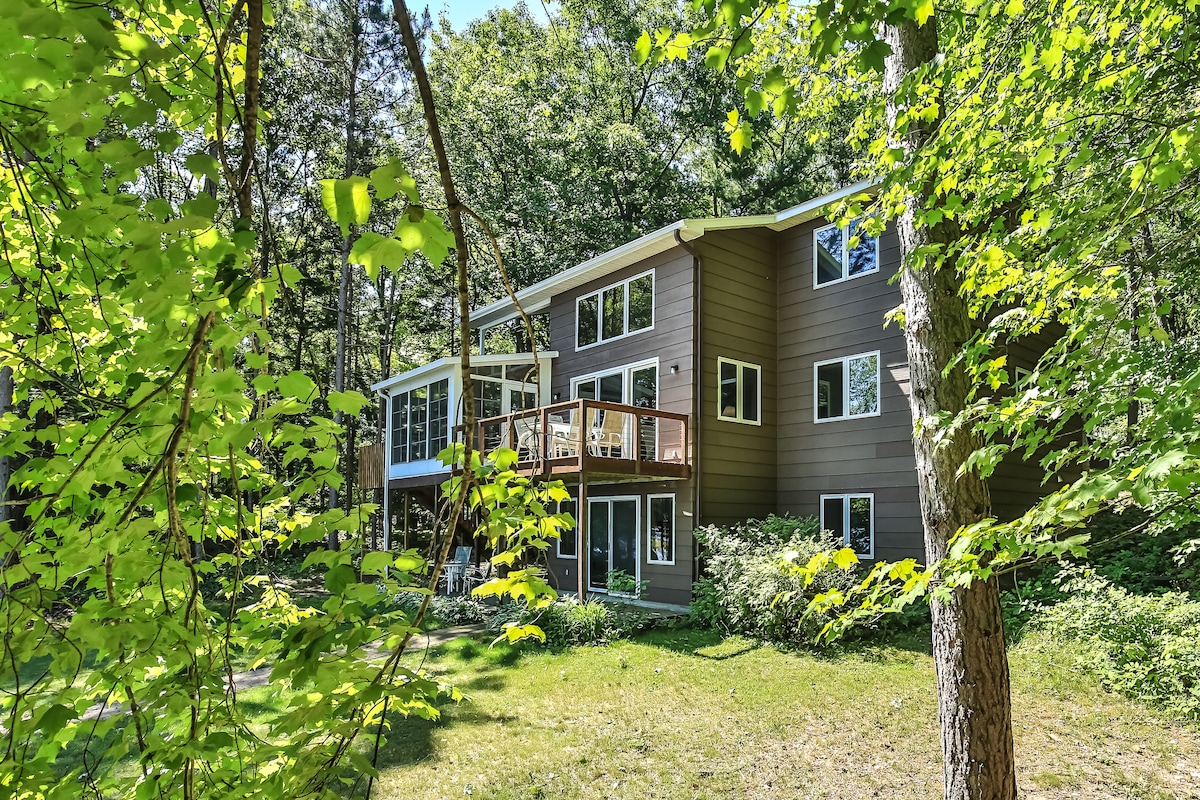 Maison confortable avec un éclairage et des couleurs de peinture chaleureuses et une décoration créative de Northwoods avec une touche de modernité. Les équipements comprennent une connexion Internet haut débit, des appareils électroménagers en acier inoxydable, une cafetière, un lave-linge et un sèche-linge à chargement frontal, des services de streaming/Apple TV, 3 téléviseurs à écran plat, 2 cheminées, la climatisation centrale et une fournaise à haut rendement. La maison est située sur 4 acres boisés (pas au bord du lac) au large d'une route de gravier bien entretenue. Très privé. Aucun voisin en vue. La faune est abondante. Les chiens sont acceptés avec approbation et frais.
