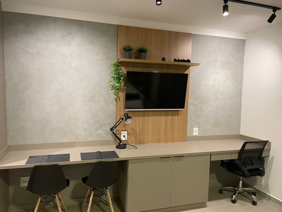 Détendez-vous dans cet endroit unique et paisible. Studio complet avec Wi-Fi, smart TV, AC, Alexa, ustensiles de cuisine, cafetière, filtre à eau, sèche-cheveux, fer à repasser et tout ce dont vous avez besoin pour votre confort. Vous pouvez opter pour 2 lits simples ou 1 lit queen size. Profitez des espaces communs tels que la piscine, l'ascenseur, le parking, la buanderie, la réception ouverte 24h/24, la salle d'étude ou de réunion et l'espace gourmet. Excellent emplacement, à proximité de l'hôpital São Francisco et de la faculté UNAERP.