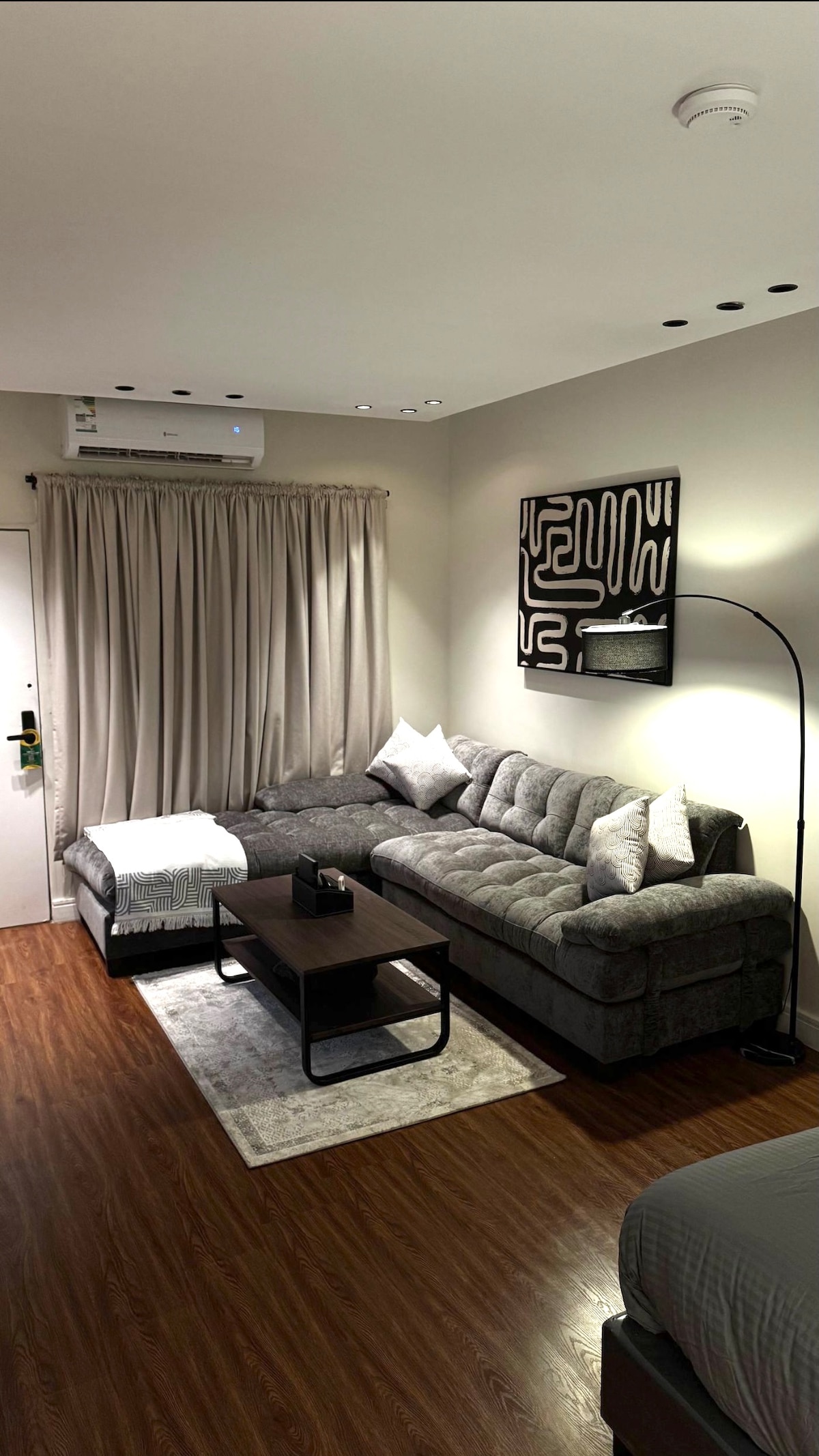 صمم هذا المكان بتصميم هادئ وانيق وباضاءة مخفيه وتعطير دائم للشعور بالراحه والاسترخاء استديو فاخر وراقي بمساحة واسعه في موقع مميز بحي الوادي في قلب الرياض قريب من جميع فعاليات موسم الرياض تفاصيل المكان .. ركن كامل خاص للقهوة والضيافة شاشة 75 عالية الدقة مع اشتراك ( Netflix + شاهد VIP + شاهد رياضة ) 5G wifi كواية ملابس مطبخ متكامل يلبي احتياجات اقامتك