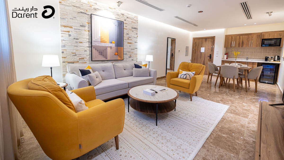 شقة فندقية فاخرة مع غرفة نوم وصالة ومطبخ وحمام