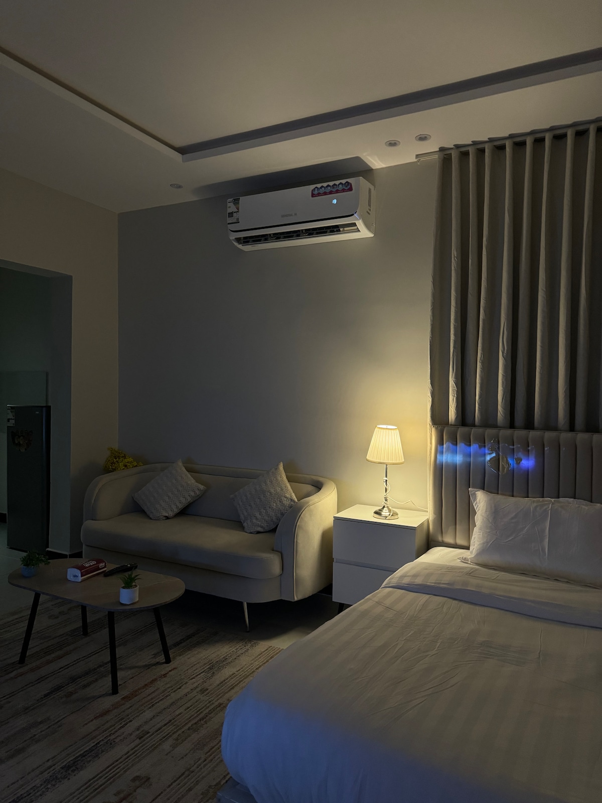 Profitez d'un séjour paisible dans une chambre élégante et classique, avec une entrée privée et une salle de bain extérieure indépendante avec une finition en marbre. La chambre est équipée de deux lits confortables, d'une table à manger, d'un coin détente, d'un réfrigérateur et d'une climatisation silencieuse. L'emplacement est dans un quartier calme et sûr au nord-est de Riyad, proche de l'aéroport et des services. Convient aux voyageurs et aux visiteurs pour des séjours courts ou longs. Propreté élevée et équipement professionnel avant chaque réservation. Il est interdit de fumer à l'intérieur de la chambre, et il n'est autorisé que dans la cour extérieure. Réservez en toute confiance et profitez d'une expérience 5 étoiles. Nous vous préparons notre café arabe avec amour, et le confort commence dès le premier instant de votre entrée
