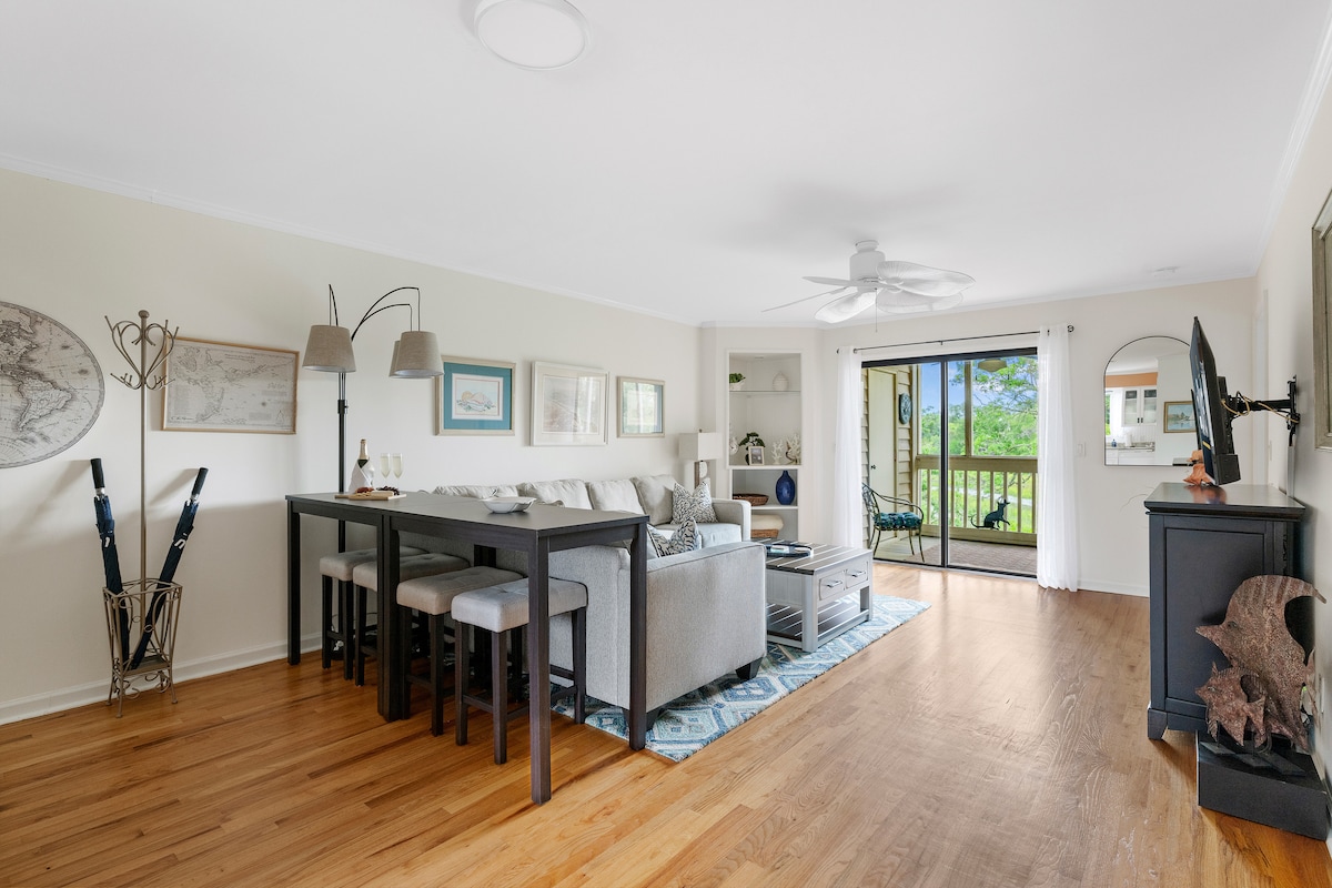 Bienvenue à Mimosa Manor, une villa de 1 chambre/1 salle de bain entièrement rénovée à quelques pas de la magnifique East Beach sur l'île de Kiawah. La villa peut accueillir confortablement quatre personnes avec une suite parentale king ET un lit Murphy queen size. Mimosa Manor est une villa au premier étage dans le complexe Mariner's Watch (à l'intérieur des portes de l'île de Kiawah) avec une vue magnifique sur les bois et se trouve à seulement 35 minutes en voiture des rues pavées du centre-ville de Charleston. Numéro de permis d'exploitation : RBL20-000419