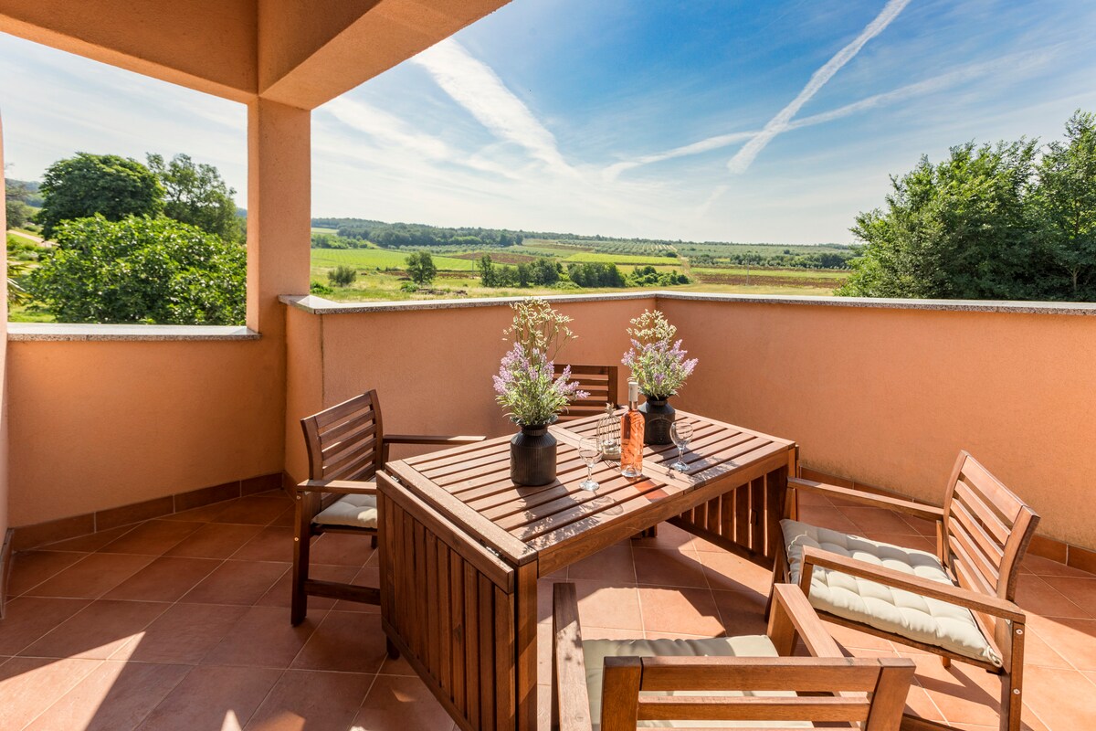 L'appartement Cristina offre des vacances reposantes avec une vue magnifique sur le paysage et Motovun. L'appartement dispose de tout ce dont vous avez besoin et se compose d'une chambre avec un lit double, d'une salle de bains, d'une cuisine et d'un salon. Devant l'appartement se trouve une terrasse avec l'une des plus belles vues sur le paysage istrien, où vous pourrez déguster un café le matin ou certains des meilleurs vins de la région le soir. Nous fournissons également une place de parking pour 1 voiture.