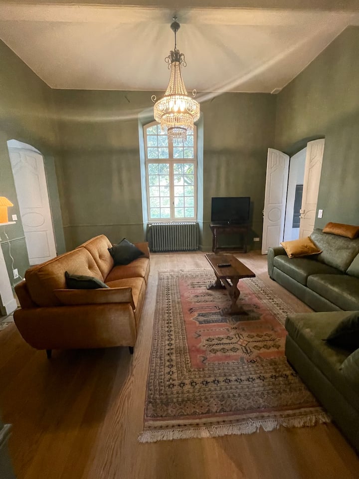 - Le Salon de 30 m2, grande hauteur sous plafond avec sa cheminée et son miroir, ses 2 canapés cosy (non convertibles), coussins, grand TV écran plat connecté, piano de musique, tapis sur parquet en chêne, fenêtre vers la terrasse (orientation sud)