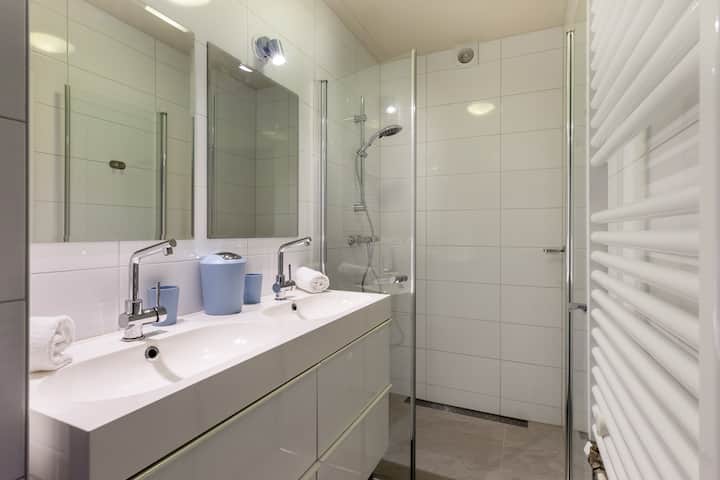 En entrant dans le logement, vous trouverez un accès immédiat aux chambres et aux salles de bain dans le couloir. La chambre principale dispose d'un lit double (160 x 200 cm) avec des matelas confortables et est en outre meublée avec des meubles pratiques tels que des tables de chevet, un bon éclairage de lit et un espace de rangement sous la forme d'une commode et d'un porte-manteau pour certains bagages. Pour les enfants ou les voyageurs supplémentaires, il y a une deuxième chambre avec un lit superposé confortable (2x80x200cm) et un espace de rangement suffisant dans l'armoire. La salle de bain est équipée d'une spacieuse armoire de salle de bain avec plus qu'assez d'espace de rangement, d'une douche et d'un radiateur à serviettes pratique. Les toilettes sont séparées de la salle de bains, et il y a également un lave-linge dans la buanderie, idéal pour faire un chargement rapide de linge entre les deux.
