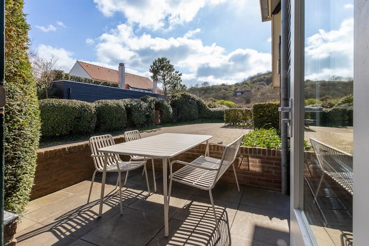 La terrasse de cet appartement à Zoutelande près de la plage est petite mais agréable. Sur cette terrasse fortifiée de 10 m2, vous pourrez profiter de l'emplacement ensoleillé du sud-est en toute intimité. C'est l'endroit idéal pour le petit déjeuner au soleil du matin ou une boisson confortable l'après-midi. Duinoord est situé dans un endroit enviable à l'extrémité de Duinweg. Vous êtes littéralement au pied des dunes, avec un accès aux dunes à proximité. Cet emplacement rend l'appartement à Zoutelande près de la plage idéal pour les amateurs de plage, les randonneurs et les cyclistes. Directement derrière l'accès à la plage, vous trouverez le pavillon de plage unique De Zeeuwse Riviera. Ici, vous pourrez déguster un verre ou un repas avec vue sur la mer. La plage du sud, connue pour avoir le plus d'heures de soleil en Zélande, est à deux pas.