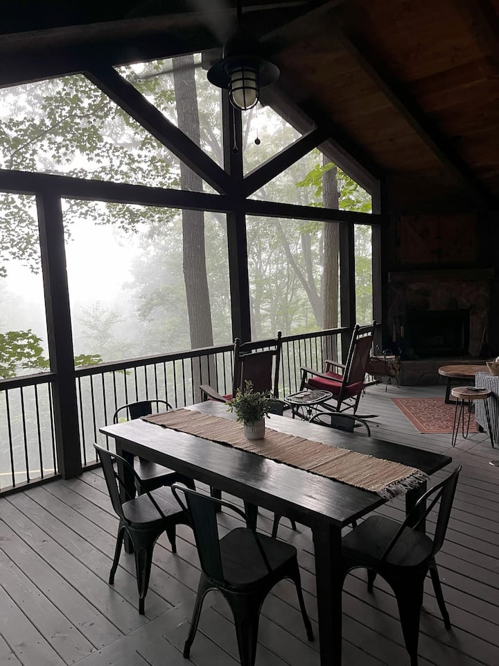 Sortez sur le porche grillagé, où un grand canapé, une cheminée à bois et une télévision intelligente vous invitent à vous détendre toute l'année. Deux chaises à bascule offrent un endroit calme pour le café du matin, tandis qu'une table à manger avec six chaises rend les repas en plein air spéciaux.