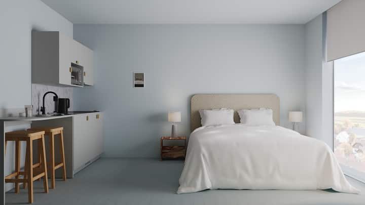 Cette chambre lumineuse et aérée de style studio comprend un lit super king avec tête de lit intégrée, un canapé et un bar pour le petit-déjeuner. Une kitchenette privée vous offre un réfrigérateur/congélateur, un micro-ondes, une plaque à induction et une machine à café, ainsi qu'une petite salle à manger. Il y a une coiffeuse avec sèche-cheveux, une armoire et un espace de rangement sous le lit. Votre propre salle de bain attenante vous offre intimité et confort, tandis que l’adhésion à la colocation et le petit déjeuner sont inclus.