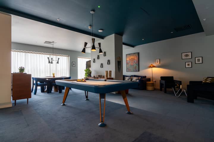 • Salle d'écran et salles de jeux avec ping-pong, piscine et tourne-disque