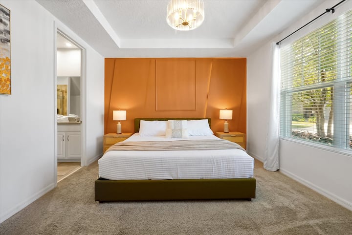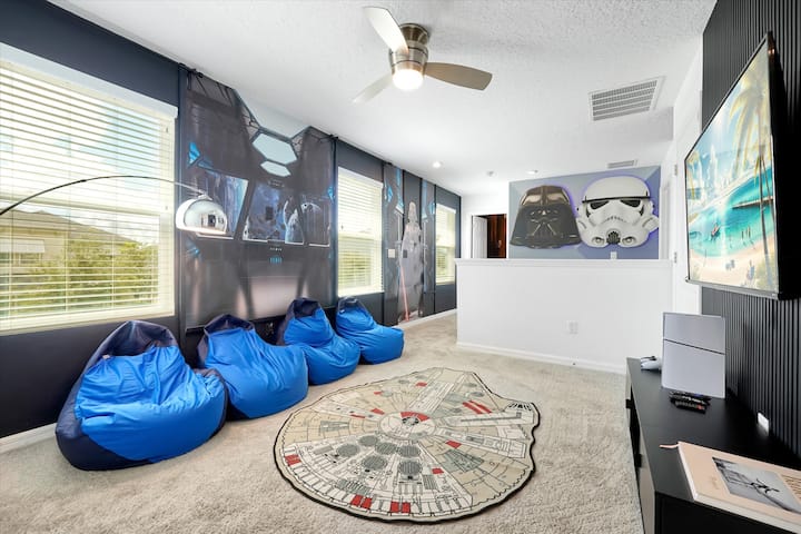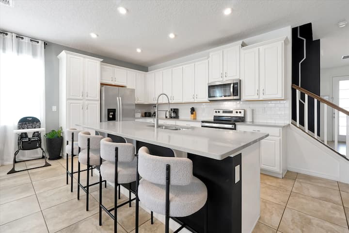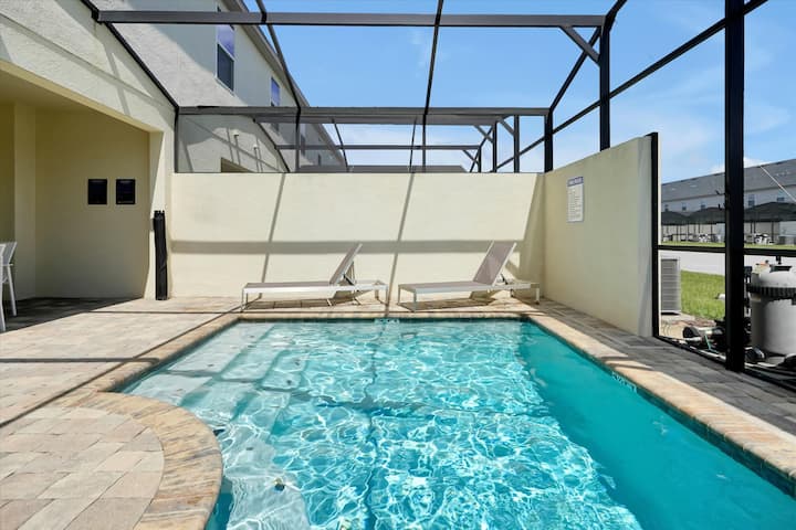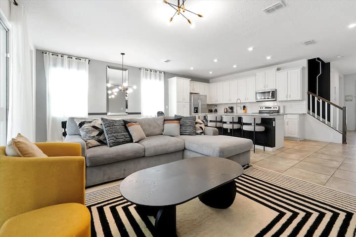Bienvenue au Solara Resort ! Cette belle maison de 5 chambres est parfaite pour les familles et les amis, avec une piscine privée, un espace barbecue et beaucoup d'espace pour se détendre. À quelques minutes de Disney, il offre une cuisine entièrement équipée, des espaces de vie élégants et tout ce dont vous avez besoin pour un séjour confortable et sans stress. Profitez d'un accès complet aux équipements de style complexe hôtelier, notamment une grande piscine, une aire de jeux pour enfants, un terrain de jeux, un centre de remise en forme, des restaurants et des bars, et bien plus encore.