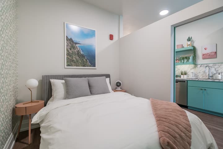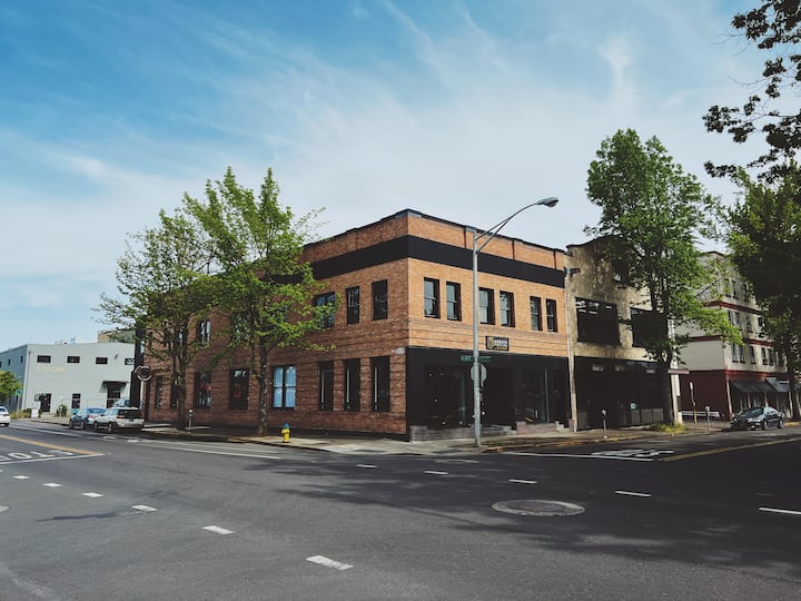 Suite 204 « TheVIBE » - Située dans « The505 Eugene », un NOUVEL hôtel/BnB de 8 suites sur 5th & Willamette St, à l'étage supérieur d'un bâtiment en briques emblématique de 1910 qui a été rénové et réinventé avec soin. Les intérieurs reflètent le caractère unique d'Eugene et du quartier du marché du centre-ville dans un style artistique et créatif.
